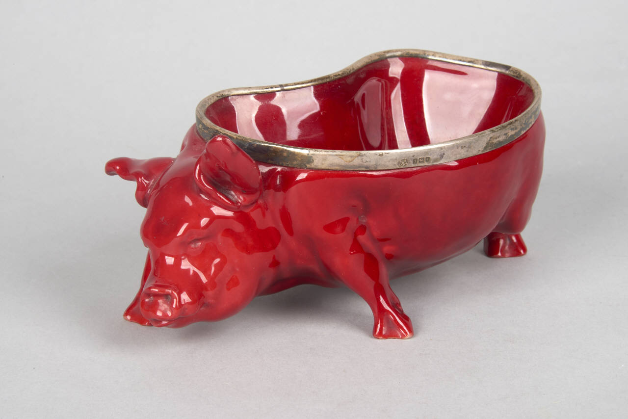 Posacenere a forma di suino in porcellana flambé con parte superiore aperta, con bordatura in argento.