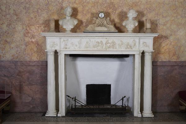 Camino in marmo con architrave (sul fronte bassorilievo in tre lastre "Trionfo di Bacco e Arianna", mentre ai lati due lastre a ornato semplice), sorretto da due colonne scanalate di ordine tuscanico ornate da piccoli rosoni nella fascia del capitello, ripresi in quella delle due semicolonne ai lati dell'apertura. La modanatura inferiore della cornice dell'architrave è decorata a foglie stilizzate.