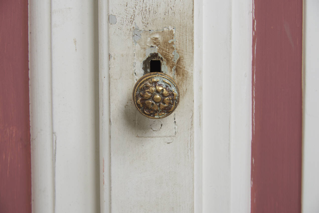 Pomello in ghisa con motivo floreale a rilievo situato nella parte bassa delle due porte-finestre.