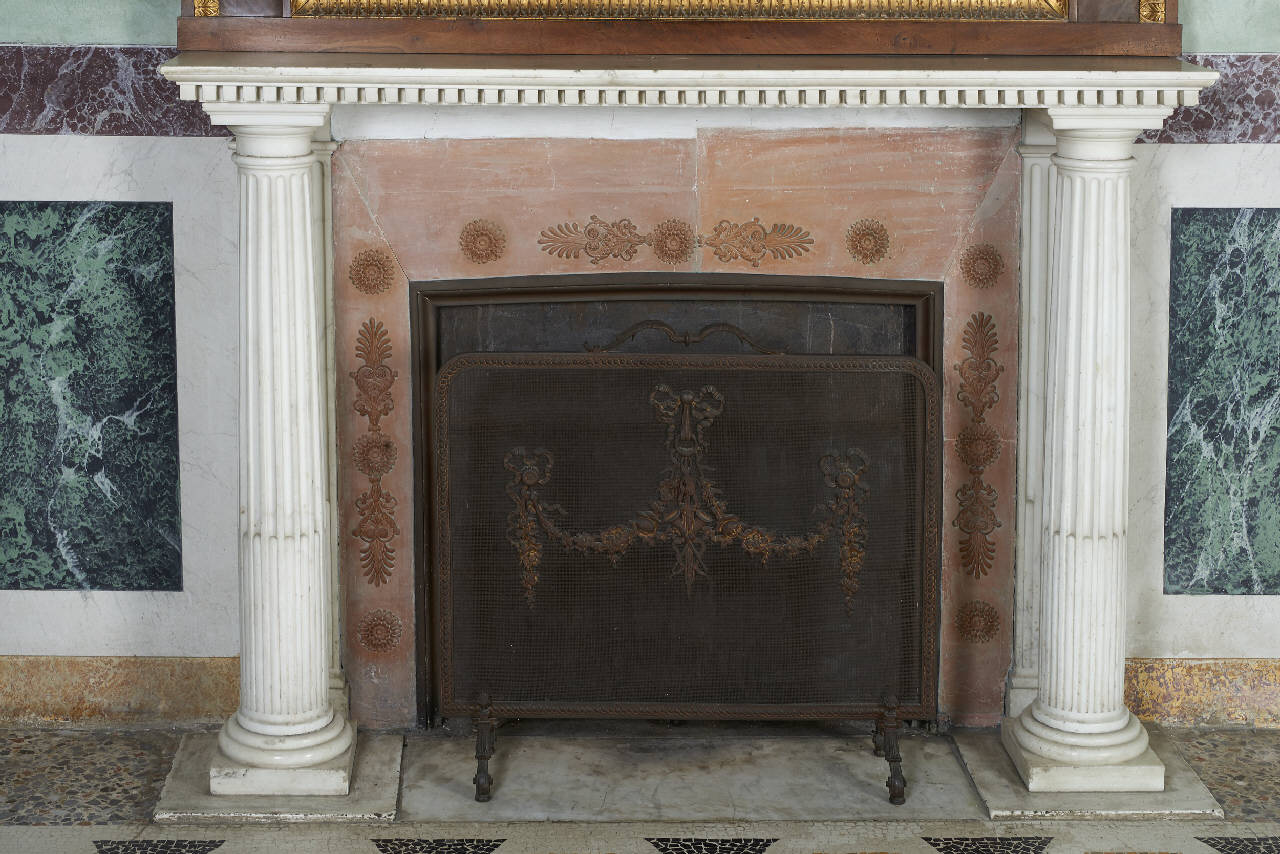 Camino in marmo bianco lunense, formato da una mensola, con bordo dentellato, sorretta da due colonne scanalate, con scanalatura rifinita alla base sul fronte delle colonne, poggiano su due semilesene ugualmente scanalate. Cornice interna, sempre di marmo, con decorazioni in bronzo a motivo di rosetta e palmette.