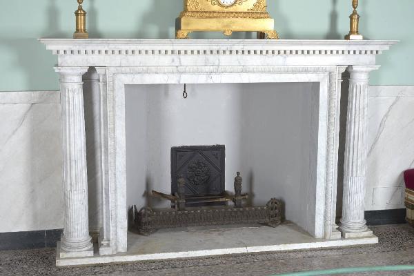 Camino in marmo bianco lunense, formato da una mensola, con bordo dentellato, sorretta da due colonne scanalate con capitello di ordine dorico. Cornice interna, sempre di marmo, con semplici decorazioni a rilievo.