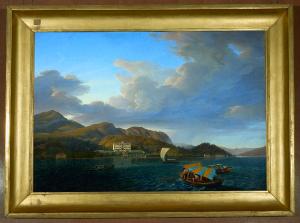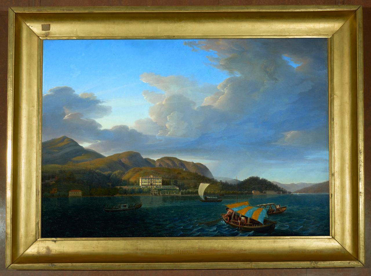 Quadro rappresentante una veduta di Villa Sommariva e del giardino antistante, ripresi dal lago, dove è raffigurata in primo piano un'imbarcazione tipica lariana, con equipaggio. Superficie del lago increspata.