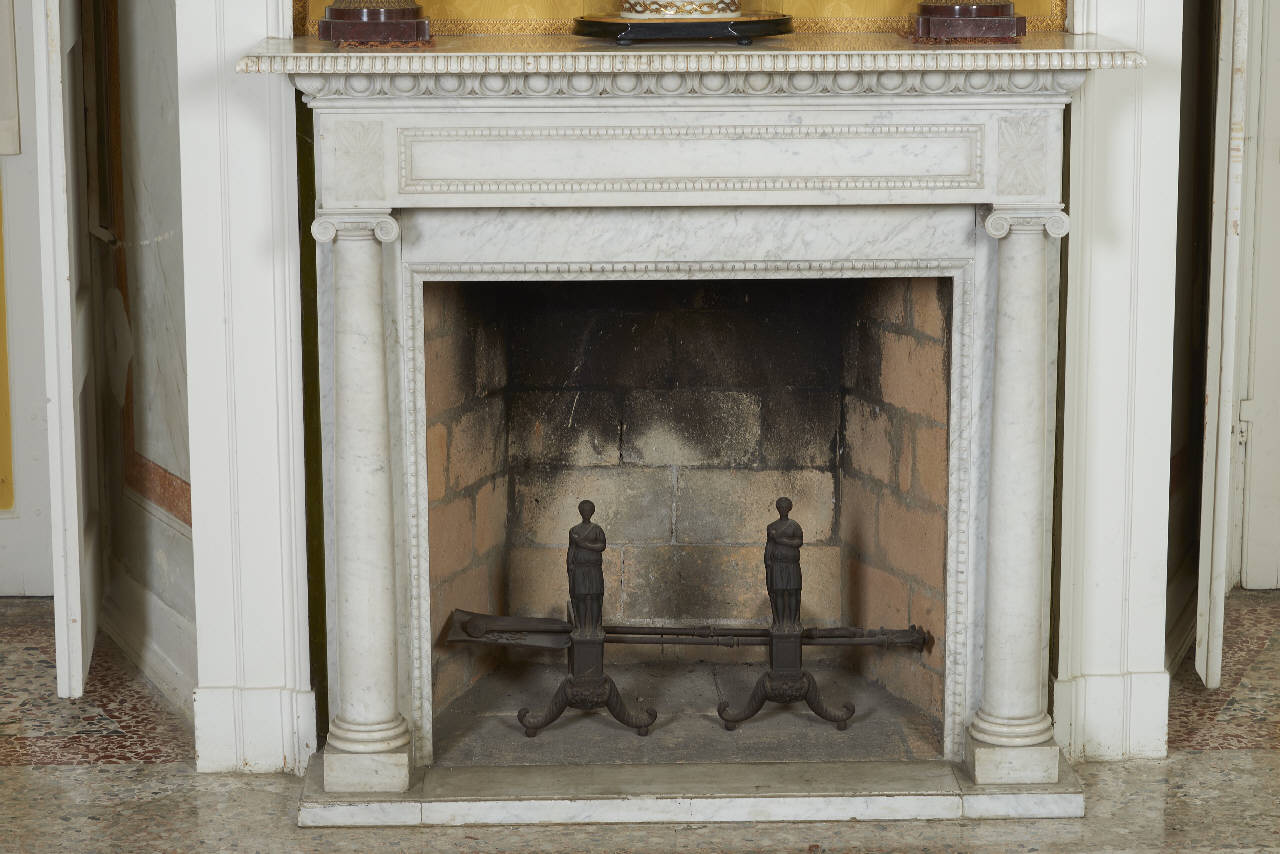 Camino di marmo bianco di Carrara scolpito e tornito. Ad andamento rettilineo è fiancheggiato da due colonne di ispirazione corinzia su cui poggia la mensola molto sporgente con decorazione a ovali e dentelli ritmati.