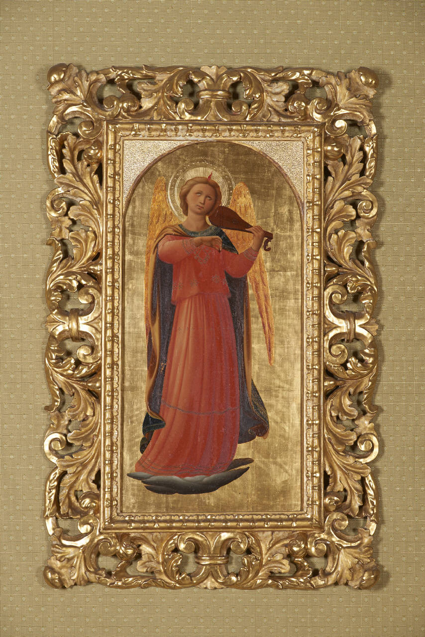 Angelo musicante: figura in piedi, vestita, con aureola. Stagliato su fondo oro, suona una mandola, appoggiata sulla spalla sinistra. La figura poggia su una nuvoletta.