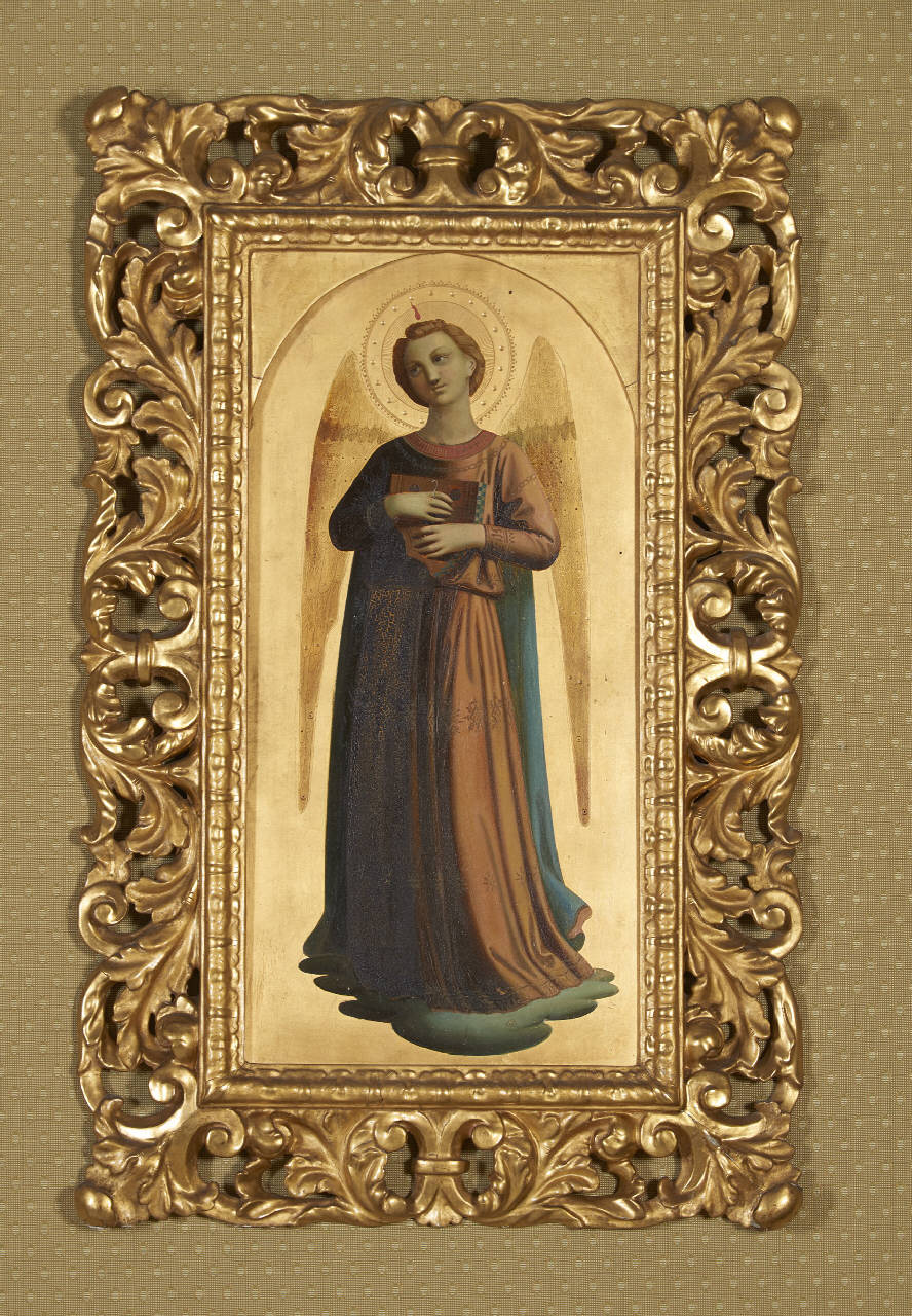 Angelo: figura in piedi, vestita, con aureola. Stagliato su fondo oro, regge con le mani uno stemma. La figura poggia su una nuvoletta.