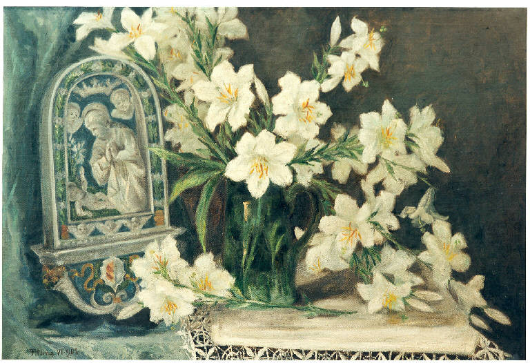 Vaso di gigli con immagine della Vergine