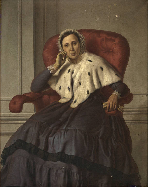 - NOTIZIE STORICO CRITICHE Il ritratto raffigura Teresa Semperboni, morta nel 1867, vedova di Ottavio Boroni, entrambi benefattori dei pii luoghi. Il dipinto presenta tutte le caratteristiche stilistiche che contraddistinguono la produzione di Gabriele Rottini, in particolare l'uso di un marcato chiaroscuro sul volto e la descrizione accurata dei dettagli di costume. A differenza di altri ritratti di benefattori, il dipinto fu eseguito quando l'effigiata era ancora in vita (Rottini era morto quasi un decennio prima della Semperboni) e, allo stato attuale delle ricerche, non è possibile sapere in quale modo il dipinto si giunto nelle collezioni dei pii luoghi bresciani, forse grazie ad un'eredità.