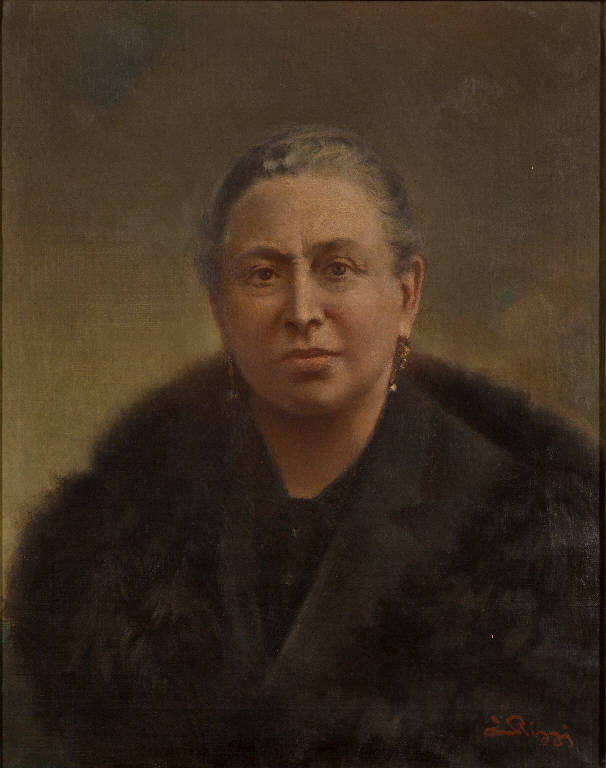 - NOTIZIE STORICO CRITICHE Il dipinto raffigura Anna Maria Girelli (1868-1945) benefattrice dell'orfanotrofio maschile che, per mezzo di legato testamentario, lasciò al pio luogo 19.575.561 lire con l'obbligo di istituire una scuola agraria per gli orfani di Lonato. In virtù del cospicuo lascito, l'opera in esame fu commissionata ad Emilio Rizzi, che all'epoca era il più celebre ritrattista di Brescia, noto per la sua scioltezza e la velocità esecutiva. Questo dipinto, alquanto severo e tradizionale, fu forse eseguito - com'era consuetudine - sul modello di una fotografia. In memoria della benefattrice, venne eseguito anche un busto in bronzo di Giovanni Asti.