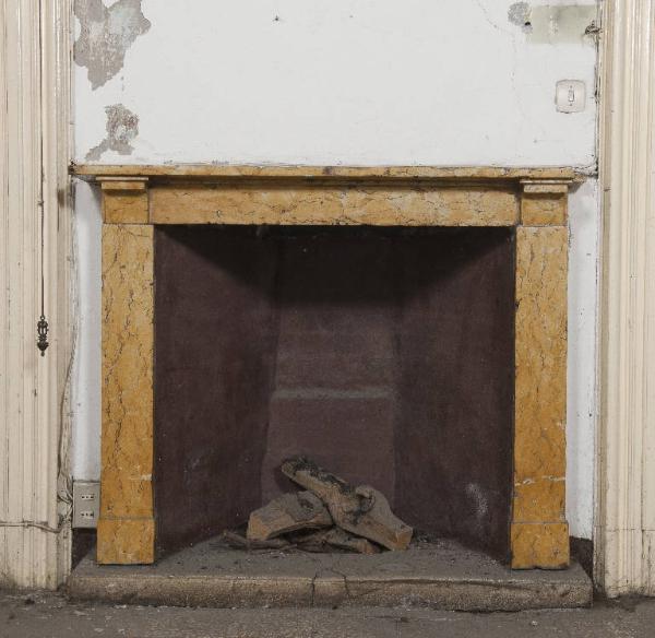Mostra di camino in marmo giallo con spalle e architrave lisci e due piccoli capitelli dal disegno stilizzato che sostengono la mensola leggermente sporgente.