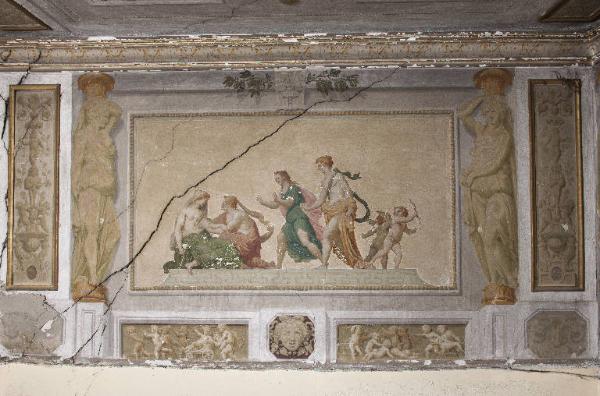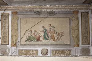 La decorazione pittorica è composta da una partitura architettonica entro la quale si dispongono tre riquadri figurati: uno, più ampio, contiene episodi della vita di Cupido, i restanti due sono realizzati a monocromo a simulare un bassorilievo e illustrano giochi di fanciulli. La cornice architettonica è strutturata da cariatidi che sostengono un architrave e poggiano su un alto basamento entro il quale si inseriscono i due riquadri più piccoli separati da un medaglione ornato da un mascherone con foglie di vite e pampini.