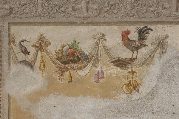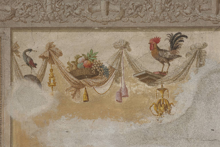 La decorazione pittorica si compone di un curioso festone fatto di drappi annodati che nelle anse ospitano animali e nature morte.