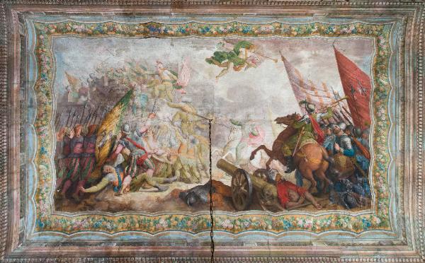 - NOTIZIE STORICO CRITICHE Nel 1782 muore Vincenzo Averoldi, ultimo erede in linea diretta maschile del casato Averoldi che aveva fondato e fatto costruire il palazzo di via Moretto e contrada Santa Croce a metà del XVI secolo. L'edificio e tutto il suo ricco contenuto passano per via ereditaria femminile (da Barbara Averoldi, sorella di Vincenzo sposata con Ferdinando Chizzola, del ramo di Erbusco) a Giuseppe e Faustino Chizzola. Assumendo anche il cognome Averoldi, i due fratelli si stabiliscono nel palazzo bresciano e avviano importanti lavori di ammodernamento e ristrutturazione del palazzo documentati dal 1787/88 fino alla fine degli anni Novanta del Settecento. I lavori modificano profondamente l'aspetto del palazzo. Le ali laterali vengono alzate di un piano per creare nell'ala est dell'edificio e nell'angolo nord-est due appartamenti privati e per fare spazio nel corpo di fabbrica occidentale ad un appartamento di società. Il piano nobile del corpo di fabbrica centrale viene completamente rivisto per dare vita al grande appartamento da parata tuttora esistente al quale si accede attraverso il monumentale scalone compiuto presumibilmente intorno al 1793.\nCuore dell'appartamento da parata è il grande salone che presenta una stupefacente decorazione a quadrature architettoniche che coinvolge, in un unico colpo d'occhio le pareti perimetrali e la volta. Sui lati finte colonne in marmo serpentino e capitelli corinzi, paraste, nicchie nelle quali sono inserite statue all'antica scandiscono lo spazio e lo dilatano con prospettive illusionistiche; sulla volta una portico colonnato si apre una ampia scena narrativa dedicata alla celebrazione della famiglia Chizzola che, in quegli anni, è divenuta proprietaria di palazzo Averoldi e ne finanzia l'ampliamento. Come se fosse dipinta su un arazzo teso fra le colonne e aperto verso il cielo, viene rappresentata l'impresa militare di Giovanni Battista Chizzola che, nella seconda metà del XVII secolo, vinse i turchi nella battaglia di Szalankemen guidando l'ottavo Reggimento di Fanteria dell'esercito dell'imperatore Leopoldo. \nNon ci sono mai stati dubbi sull'autografia e sulla cronologia delle quadrature architettoniche delle pareti e delle volte che sono datate 1786 e firmate da Giuseppe Manfredini sullo scudo di una delle statue della parete nord. E', invece, più dibattuta la vicenda critica del grande affresco narrativo che si trova al centro della volta: pur con qualche dubbio viene attribuito a Manfredini anche se Marco Tanzi non è completamente convinto di questa attribuzione e rileva uno scarto stilistico e cronologico fra la decorazione delle pareti e della scena figurata dedicata alla battaglia. Questa incongruenza troverebbe conferma in alcune note contenuto in un libro cassa settecentesco che documenta le spese sostenute per la ristrutturazione del palazzo e che è stato fortunosamente recuperato e pubblicato da Giuseppe Merlo. Secondo queste note manoscritte il pittore Saverio Gandini riceve, nel 1789, un cospicuo pagamento per la realizzazione di un dipinto sul "volto della sala superiore" che Merlo identifica proprio con la rappresentazione dell'impresa militare dell'avo dei Chizzola, attribuendola appunto a Gandini. \nNon è della stessa opinione Stefania Cretella che, invece, assegna la scena figurata della volta a Giuseppe Teosa collegandola al pagamento ricevuto dal pittore il 22 marzo 1796 "a saldo della medaglia fatta nella sala superiore". Secondo la studiosa, infatti, lo scarto cronologico fra l'intervento del Gandini e quello del Manfredini sarebbe troppo ampio così come è difficoltoso immaginare le modalità di armonizzazione della quadratura architettonica con la scena di battaglia.