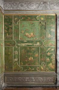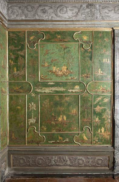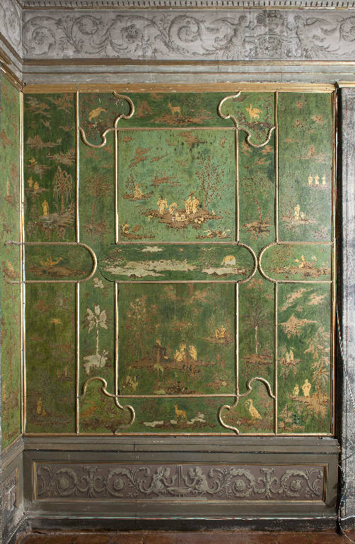 - NOTIZIE STORICO CRITICHE La cosiddetta Sala Cinese di Palazzo Averoldi - identificata anticamente come Sala Verde - costituisce un unicum nel territorio bresciano per la decorazione a pannelli lignei laccati di soggetto orientale realizzati con fondo verde e figure in ocra. Attualmente si presenta come un insieme unitario e apparentemente omogeneo in tutti i suoi elementi che comprendono, oltre alla boiserie anche quattro dipinti sovraporte, una controsoffittatura lignea con dipinti su tavola e su tela e un fregio a con motivi a grottesche. Come tale è sempre stato interpretato dalla critica che considera degli originali cinesi le lacche componenti la boiserie e attribuisce le sovraporte e il medaglione centrale della volta alternativamente a Manfredini (Tanzi) o Teosa (Cretella). \nIn realtà le ricerche archivistiche e la ricostruzione delle vicende storico - architettoniche di Palazzo Averoldi condotte da Pietro Balzani per la redazione della sua tesi di laurea (proposta in bibliografia) hanno fatto emergere alcuni significativi elementi che mostrano come l'aspetto attuale della sala sia frutto di interventi cronologicamente distinti e ascrivibili a diverse personalità artistiche.\nLa boiserie composta da dipinti di tema orientale risulta essere l'elemento più antico della sala, messo in opera, probabilmente, fra gli anni Cinquanta e Settanta del Settecento. Alcuni inventari relativi ai beni e agli arredi di palazzo Averoldi risalenti alla metà del Settecento ed in particolare uno, databile agli anni 70/80 dello stesso secolo, citano ripetutamente una sala verde che viene usata come salotto da ricevimento e può essere facilmente identificata come la Sala cinese (il verde diventa l'elemento qualificativo della stanza ed è riduttivo ritenere che sia dovuto a una semplice tinteggiatura delle pareti, è più credibile immaginarlo riferito alla boiserie in stile orientale, prepotentemente caratterizzata da questo colore). Questa ricostruzione cronologica trova conferma anche in un accordo stipulato nel novembre del 1791 con il signor Girolamo Romano che riceve l'incarico per il "ristauro delle Assi, che servono di Tapezzeria alla stanza Verde accomodata alla Chinese, con figure ed alberi d'oro". E' una frase essenziale, ma in essa può trovare conferma la datazione proposta da Balzani per la realizzazione della boiserie fissata alla metà del Settecento. Se nel 1791, infatti, i pannelli in stile orientale necessitano di un intervento di restauro, è decisamente plausibile che siano in opera almeno da qualche decennio. Un secondo elemento che emerge è la relazione con i lavori di ammodernamento, ampliamento e decorazione pittorica che, proprio nell'ultimo decennio del XVIII secolo, si stanno svolgendo nelle sale limitrofe del palazzo che fanno parte del grande appartamento da parata voluto da Faustino e Giuseppe Chizzola. Le altre stanze vengono "fatte a nuovo", mentre nella sala verde vengono mantenute e restaurate le lacche, probabilmente perché viene riconosciuto loro un valore di unicità. Questo non significa, però, che anche qui non siano previsti interventi di ammodernamento. Balzani ha, infatti, rinvenuto nell'archivio privato della famiglia Averoldi pagamenti e accordi con Saverio Gandini per le opere realizzate e da realizzare nella camera verde (è documentato un saldo il 5 gennaio del 1791 per le opere fatte fino a quella data e un accordo datato allo stesso giorno per opere "da farsi" sempre nella camera verde). Stando ai documenti, Gandini deve coordinare il falegname incaricato di realizzare il controsoffitto ligneo e i pannelli che rivestono la parte inferiore delle pareti e di procedere, poi, al loro decoro. Si deve occupare anche del cornicione con le mensole e il fregio e di tutte le campiture della volta ad esclusione del medaglione centrale. Quest'ultimo spetta ad un pittore di figura che può essere identificato con Giuseppe Teosa che riceve dei cospicui pagamenti nel corso del 1791. Per la doratura del cornicione del soffitto interviene anche il doratore Giuseppe Mondini come testimonia una fattura emessa il 24 giugno 1791. Questi nuovi elementi documentari e le precisazioni cronologiche riaprono il dibattito critico relativo ai tempi e ai modi alla diffusione del gusto orientaleggiante nel territorio bresciano e sull'autografia dei pannelli lignei che già Stefania Cretella riteneva essere non originali cinesi, ma "dipinti in stile".