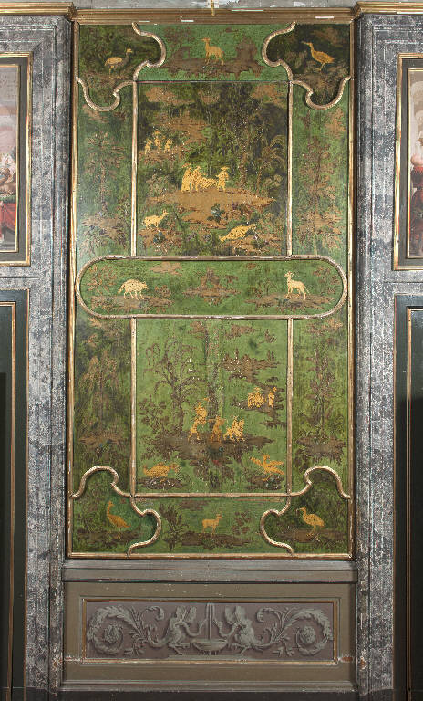 - NOTIZIE STORICO CRITICHE La cosiddetta Sala Cinese di Palazzo Averoldi - identificata anticamente come Sala Verde - costituisce un unicum nel territorio bresciano per la decorazione a pannelli lignei laccati di soggetto orientale realizzati con fondo verde e figure in ocra. Attualmente si presenta come un insieme unitario e apparentemente omogeneo in tutti i suoi elementi che comprendono, oltre alla boiserie anche quattro dipinti sovraporte, una controsoffittatura lignea con dipinti su tavola e su tela e un fregio a con motivi a grottesche. Come tale è sempre stato interpretato dalla critica che considera degli originali cinesi le lacche componenti la boiserie e attribuisce le sovraporte e il medaglione centrale della volta alternativamente a Manfredini (Tanzi) o Teosa (Cretella). \nIn realtà le ricerche archivistiche e la ricostruzione delle vicende storico - architettoniche di Palazzo Averoldi condotte da Pietro Balzani per la redazione della sua tesi di laurea (proposta in bibliografia) hanno fatto emergere alcuni significativi elementi che mostrano come l'aspetto attuale della sala sia frutto di interventi cronologicamente distinti e ascrivibili a diverse personalità artistiche.\nLa boiserie composta da dipinti di tema orientale risulta essere l'elemento più antico della sala, messo in opera, probabilmente, fra gli anni Cinquanta e Settanta del Settecento. Alcuni inventari relativi ai beni e agli arredi di palazzo Averoldi risalenti alla metà del Settecento ed in particolare uno, databile agli anni 70/80 dello stesso secolo, citano ripetutamente una sala verde che viene usata come salotto da ricevimento e può essere facilmente identificata come la Sala cinese (il verde diventa l'elemento qualificativo della stanza ed è riduttivo ritenere che sia dovuto a una semplice tinteggiatura delle pareti, è più credibile immaginarlo riferito alla boiserie in stile orientale, prepotentemente caratterizzata da questo colore). Questa ricostruzione cronologica trova conferma anche in un accordo stipulato nel novembre del 1791 con il signor Girolamo Romano che riceve l'incarico per il "ristauro delle Assi, che servono di Tapezzeria alla stanza Verde accomodata alla Chinese, con figure ed alberi d'oro". E' una frase essenziale, ma in essa può trovare conferma la datazione proposta da Balzani per la realizzazione della boiserie fissata alla metà del Settecento. Se nel 1791, infatti, i pannelli in stile orientale necessitano di un intervento di restauro, è decisamente plausibile che siano in opera almeno da qualche decennio. Un secondo elemento che emerge è la relazione con i lavori di ammodernamento, ampliamento e decorazione pittorica che, proprio nell'ultimo decennio del XVIII secolo, si stanno svolgendo nelle sale limitrofe del palazzo che fanno parte del grande appartamento da parata voluto da Faustino e Giuseppe Chizzola. Le altre stanze vengono "fatte a nuovo", mentre nella sala verde vengono mantenute e restaurate le lacche, probabilmente perché viene riconosciuto loro un valore di unicità. Questo non significa, però, che anche qui non siano previsti interventi di ammodernamento. Balzani ha, infatti, rinvenuto nell'archivio privato della famiglia Averoldi pagamenti e accordi con Saverio Gandini per le opere realizzate e da realizzare nella camera verde (è documentato un saldo il 5 gennaio del 1791 per le opere fatte fino a quella data e un accordo datato allo stesso giorno per opere "da farsi" sempre nella camera verde). Stando ai documenti, Gandini deve coordinare il falegname incaricato di realizzare il controsoffitto ligneo e i pannelli che rivestono la parte inferiore delle pareti e di procedere, poi, al loro decoro. Si deve occupare anche del cornicione con le mensole e il fregio e di tutte le campiture della volta ad esclusione del medaglione centrale. Quest'ultimo spetta ad un pittore di figura che può essere identificato con Giuseppe Teosa che riceve dei cospicui pagamenti nel corso del 1791. Per la doratura del cornicione del soffitto interviene anche il doratore Giuseppe Mondini come testimonia una fattura emessa il 24 giugno 1791. Questi nuovi elementi documentari e le precisazioni cronologiche riaprono il dibattito critico relativo ai tempi e ai modi alla diffusione del gusto orientaleggiante nel territorio bresciano e sull'autografia dei pannelli lignei che già Stefania Cretella riteneva essere non originali cinesi, ma "dipinti in stile".