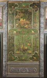 Il pannello occupa interamente la parte a sinistra della porta ed ha, nel suo insieme, una forma quadrata segnata da una cornice dorata modanata e rilevata. Si compone di tredici dipinti a fondo verde con figure in ocra, dettagli decorativi floreali policromi e finitura a lacca. Le tavole hanno forme e dimensioni diverse, ma sono composte per creare un insieme armonico; ciascuna ha una cornice modanata e dorata che ne segue il profilo e camuffa il punto di giunzione con le altre. La composizione dei dipinti è caratterizzata da una disposizione ad isolotti con radici a vista.