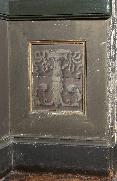 La boiserie copre il profilo inferiore delle pareti della sala e consta di un pannello ligneo sagomato, nella parte centrale, ad imitare un nicchia profilata in oro. Al centro di essa si sviluppa un motivo decorativo a candelabra.