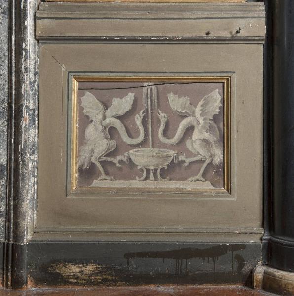 La boiserie copre il profilo inferiore delle pareti della sala e consta di un pannello ligneo sagomato, nella parte centrale, ad imitare un nicchia profilata in oro. Al centro di essa si sviluppa un motivo decorativo che ha il suo fulcro in una fontana zampillante alla quale si abbeverano due draghi alati.