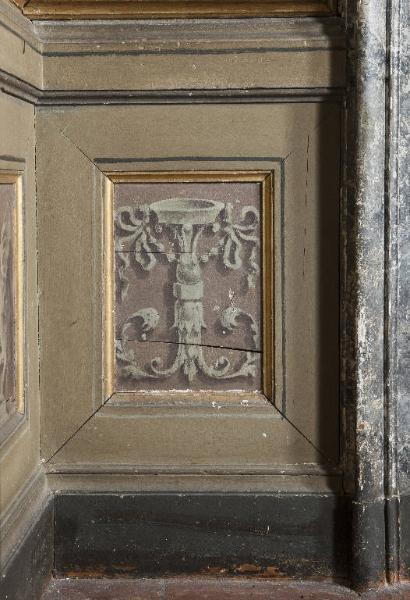 La boiserie copre il profilo inferiore delle pareti della sala e consta di un pannello ligneo sagomato, nella parte centrale, ad imitare un nicchia profilata in oro. Al centro di essa si sviluppa un motivo decorativo a candelabra.