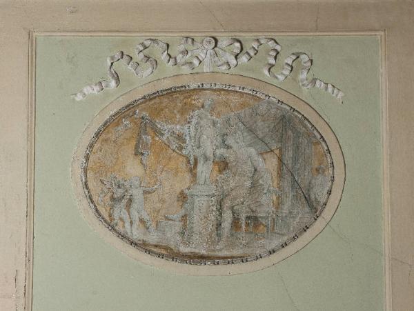 La decorazione si compone di inserti in stucco modellato e dipinto che creano motivi vegetali e nastri e di una cornice ovale definita da perle e fusi che contiene un riquadro narrativo.