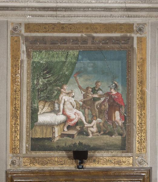 - NOTIZIE STORICO CRITICHE Nel 1782 muore Vincenzo Averoldi, ultimo erede in linea diretta maschile del casato Averoldi che aveva fondato e fatto costruire il palazzo di via Moretto e contrada Santa Croce a metà del XVI secolo. L'edificio e tutto il suo ricco contenuto passano per via ereditaria femminile (da Barbara Averoldi, sorella di Vincenzo sposata con Ferdinando Chizzola, del ramo di Erbusco) a Giuseppe e Faustino Chizzola. Assumendo anche il cognome Averoldi, i due fratelli si stabiliscono nel palazzo bresciano e avviano importanti lavori di ammodernamento e ristrutturazione del palazzo documentati dal 1787/88 fino alla fine degli anni Novanta del Settecento. I lavori modificano profondamente l'aspetto del palazzo. Le ali laterali vengono alzate di un piano per creare nell'ala est dell'edificio e nell'angolo nord-est due appartamenti privati e per fare spazio nel corpo di fabbrica occidentale ad un appartamento di società che comprendeva una ampia sala, un salotto da ricevimento, una saletta da conversazione e una camera con alcova e alcuni spazi minori. Nonostante l'appartamento sia stato danneggiato durante il bombardamento che la notte del 24 febbraio 1945 colpì la città di Brescia, sono sopravvissute, con danni, più o meno gravi il salotto da ricevimento, la saletta da conversazione e la camera con alcova con la relativa decorazione pittorica.\nNella camera con alcova dell'appartamento di società la decorazione pittorica è concentrata sulle volte di entrambi gli ambienti con le uniche eccezioni del dipinto inserito sopra la porta che collega la sala delle stagioni con la camera e delle due figure maschili dipinte sull'arco che introduce nello spazio dell'alcova. Gli affreschi sono unanimemente attribuiti al Manfredini e Stefania Cretella li data al 1794 collegandoli al pagamento ricevuto dall'artista cremonese il 9 maggio 1794 "a saldo fatture fatte nell'arcova dell'ala a sera". Questa precisazione cronologica qualifica l'intervento del Manfredini nell'alcova come il primo nell'intero appartamento precedente anche a quello della Sala delle Stagioni.
