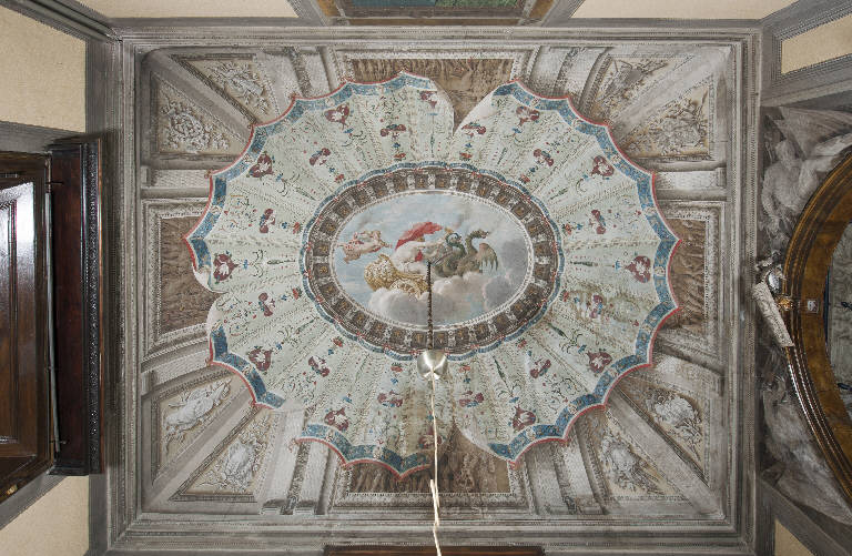 La volta della sala presenta un decorazione pittorica fantasiosa e ricca: dall'ovale centrale, che racciude la scena narrativa ed è definito da una cornice a lacunari, si diparte un velario ad ombrello bianco decorato a grottesche che lascia intravedere la sottostante quadratura architettonica all'interno della quale si inseriscono partiti decorativi ad imitazione di bassorilevi con trofei d'armi e cortei trionfali all'antica.