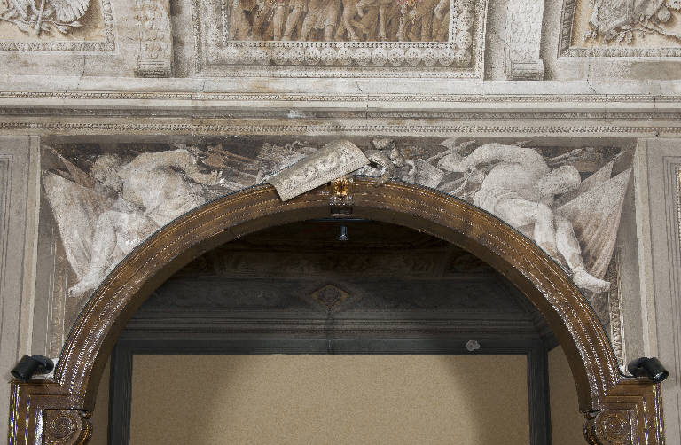 - NOTIZIE STORICO CRITICHE Nel 1782 muore Vincenzo Averoldi, ultimo erede in linea diretta maschile del casato Averoldi che aveva fondato e fatto costruire il palazzo di via Moretto e contrada Santa Croce a metà del XVI secolo. L'edificio e tutto il suo ricco contenuto passano per via ereditaria femminile (da Barbara Averoldi, sorella di Vincenzo sposata con Ferdinando Chizzola, del ramo di Erbusco) a Giuseppe e Faustino Chizzola. Assumendo anche il cognome Averoldi, i due fratelli si stabiliscono nel palazzo bresciano e avviano importanti lavori di ammodernamento e ristrutturazione del palazzo documentati dal 1787/88 fino alla fine degli anni Novanta del Settecento. I lavori modificano profondamente l'aspetto del palazzo. Le ali laterali vengono alzate di un piano per creare nell'ala est dell'edificio e nell'angolo nord-est due appartamenti privati e per fare spazio nel corpo di fabbrica occidentale ad un appartamento di società che comprendeva una ampia sala, un salotto da ricevimento, una saletta da conversazione e una camera con alcova e alcuni spazi minori. Nonostante l'appartamento sia stato danneggiato durante il bombardamento che la notte del 24 febbraio 1945 colpì la città di Brescia, sono sopravvissute, con danni, più o meno gravi il salotto da ricevimento, la saletta da conversazione e la camera con alcova con la relativa decorazione pittorica.\nNella camera con alcova dell'appartamento di società la decorazione pittorica è concentrata sulle volte di entrambi gli ambienti con l'unica eccezione del dipinto inserito sopra la porta che collega la sala delle stagioni con la camera e delle due figure maschili dipinte sull'arco che introduce nello spazio dell'alcova. Gli affreschi sono unanimemente attribuiti al Manfredini e Stefania Cretella li data al 1794 collegandoli al pagamento ricevuto dall'artista cremonese il 9 maggio 1794 "a saldo fatture fatte nell'arcova dell'ala a sera". Questa precisazione cronologica qualifica l'intervento del Manfredini nell'alcova come il primo nell'intero appartamento precedente anche a quello della Sala delle Stagioni.
