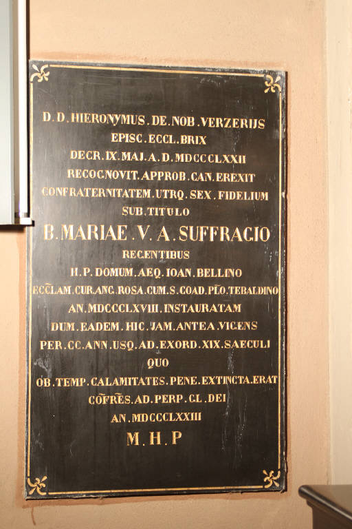 - NOTIZIE STORICO CRITICHE La lapide documenta il riconoscimento e l'approvazione della confraternita della Beata Vergine del Suffragio da parte del Vescovo Girolamo Verzeri.