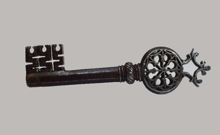 Chiave con pettine composto da tre elementi separati ciascuno con una mappa a serpentina che si chiude con uno spazio concavo. L'asta è bombata con un cordone a rilievo decorativo nella parte superiore che fa da base all'anello circolare decorato con un traforo a motivi geometrici. L'impugnatura è completata da un piccolo fastigio definito da volute e cavo al centro che serviva, con ogni probabilità, per agganciare la chiave ad un supporto.