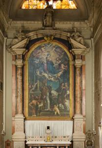 - NOTIZIE STORICO CRITICHE L'insieme dell'altare è un pregevole esempio dell'austero classicismo che caratterizza l'altaristica bresciana della prima metà del XVII secolo, fortemente influenzata dalla riforma cattolica in generale ed in particolare dai dettami di San Carloo Borromeo. L'ancona e la mensa dell'altare maggiore sono compiute nel 1616, probabilmente secondo un disegno progettuale dello stesso architetto dell'edificio, Pier Maria Bagnadore. Nel 1627 furono aggiunte all'ancona le statue delle Virtù teologali.