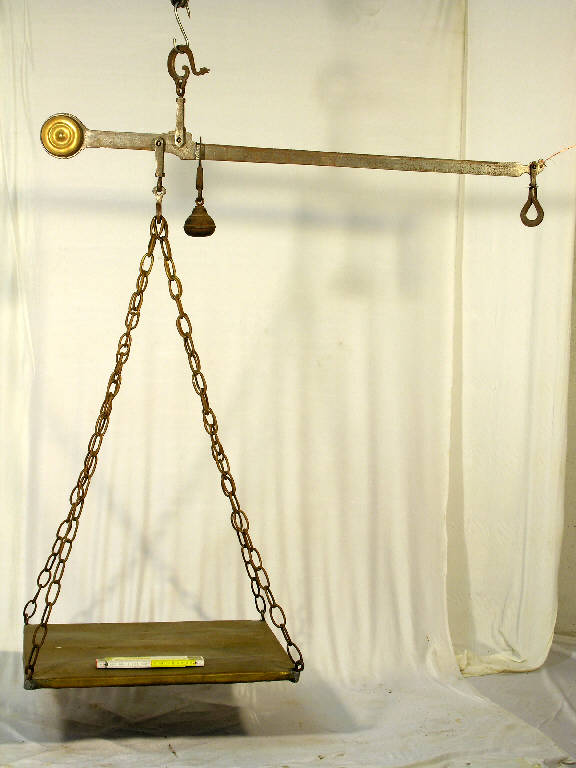 L'oggetto completo è costituito da 3 parti: Stadera: asta in acciaio, estremità allargata del braccio minore racchiusa fra due pesanti dischi di ottone, riempiti di piombo, con funzione di contrappeso; coltelli con sezione a goccia in acciaio riportato; supporti dei coltelli in acciaio riportato; scala graduata ogni unità da 1 a 20, graduazione ogni mezza unità; gancio di sospensione aperto, sagomato a testa d'anitra e gancio terminale ad anello; punzonatura sul braccio minore (su una faccia): "PORTATA CON N 3 (?) / RADDOPPI KILOG 100 / PESO RAD 40 KG 300(?) / RAD 20 KG 150 / RAD 20 KG 150". (sull'altra faccia): "ROMANO GR (1)4 (00) / CATENA GR (...)" Le punzonature annuali sono poco leggibili. Romano: in ferro, sia il peso che il suo gancio aperto di sospensione; punzonature: "R. G. 1400" e "P. K. 100"; sul gancio punzonature annuali: (03 04) (05 06) (07 08) (09 10) (11 12) (13 14) (15 16) (17 18) (19 20) (21 22) (23 24) (25 26) (27 28) (29 30) (31 32) (33 34) (35 36) (37 38) (39 40). Piatto: in ottone, quadrato, sospeso con 4 catene ad anelli in acciaio.