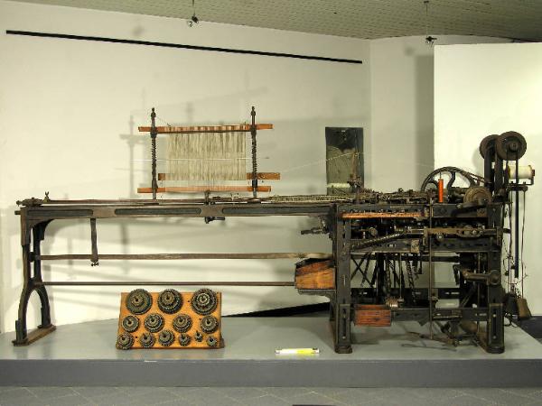 L'oggetto completo è costituito dalla macchina e da un supporto in legno per l'ordinata raccolta dei 39 ingranaggi cambia-passo. Il corpo centrale della macchina, con il meccanismo di intreccio delle maglie, è posto a destra. Nella parte sinistra i tenditori della sequenza di maglie in formazione.