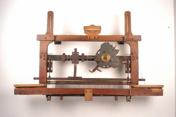 L'oggetto è una cassa battente in legno, dotata di un eccentrico in ferro e ottone per l'inserimento di un ordito supplementare secondo il disegno, di un pettine mobile ad aghi e portanavetta per lancio manuale. Il movimento è manuale.