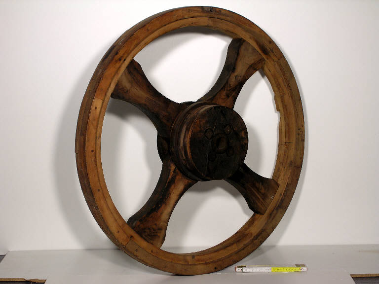 Ruota in legno con sede centrale per l'alloggiamento dell'alberino che riceve il movimento da quello centrale.