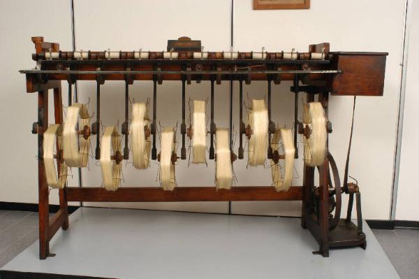 La macchina, ad una sola faccia, è costituita da un corpo in legno che porta in basso un ordine di "aspini" in filo metallico su cui vengono caricate le matasse da incannare e in alto un ordine di rocchetti, che raccolgono la seta incannata. I rocchetti sono infilati su "fusetti" di acciaio che portano fissato da una parte un "borlino" di legno che riceve per frizione il movimento di rotazione impartito dal sottostante "volantino" montato sull'albero orizzontale in acciaio ("tromba"). L'estremità del fusetto che porta il borlino può alloggiare in due sedi: quella posteriore per la posizione di marcia e quella anteriore per la posizione di riposo dei rocchetti. Nel loro movimento di rotazione i rocchetti trascinano quindi gli aspini, per mezzo del filo che va svolgendosi dagli ultimi per avvolgersi sui primi. Una zettiera di legno con riccioli di vetro riceve il movimento (rotatorio) dall'albero, il quale, grazie a coppie di ingranaggi, viene trasformato in moviemnto di va e vieni. Gli aspini (in filo metallico, a 6 appoggi e abbattibili) sono montati su due ordini. La macchina possiede un motore elettrico con etichetta metallica: San Giorgio - Soc. An. Ind. Sestri Ponente - Anno 193(?)
