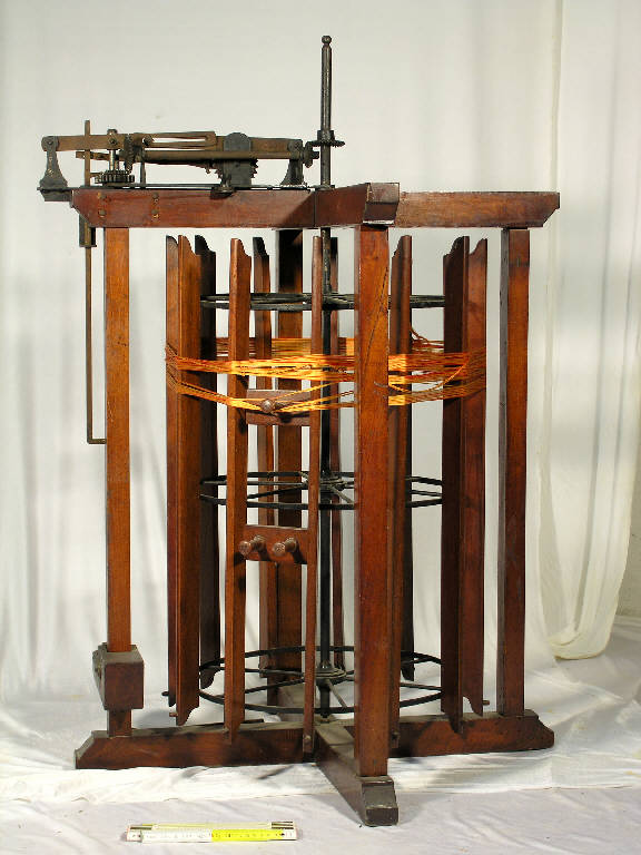 L'oggetto è una riproduzione in scala di un tamburo di orditoio verticale, su modello di Leonardo Da Vinci.