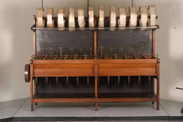 La macchina è suddivisa in due sezioni, ciascuna con una fila di aspini in alto, dove si colloca la matassa, ed una fila di aspini in basso, dove vanno a formarsi le matasse di lunghezza prestabilita. L'aspo per l'avvolgimento della matassa destinata all'assaggio ha un perimetro di m 1,125. Il movimento è a motore