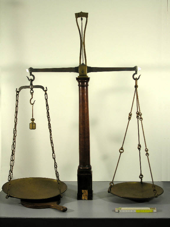 Bilancia a due bracci uguali, con colonna in legno e piatti in ottone. Colonna in legno tornita e decorata con due capitelli, uno in alto e uno alla base. Indice in acciaio verso l'alto. Coltelli e piani di appoggio in acciaio riportato. Giogo in acciaio con le estremità "a scatola aperta", entrambe terminanti con un gancio aperto; punzonatura "PORTATA CHILOGR 20". Il gancio di destra porta un piatto circolare di ottone sostenuto da tre catene a segmenti rigidi, riunite in un anello sospeso al gancio. Il gancio di sinistra porta un piatto circolare di ottone, più grande del precedente, sostenuto da 4 catene ad anelli, riunite a coppie, ciascuna in un anello. I due anelli sono sospesi ai ganci aperti di un supporto a due bracci, sostenuto, tramite un anello, dal gancio terminale del giogo. Al centro dei due bracci è sospeso un gancio aperto supplementare. La staffa su cui poggia il giogo è in ottone e continua verso l'alto, nella parte posteriore, con una piastra traforata, sempre in ottone, con scala graduata incisa, di riferimento per l'indice. Punzonature sul giogo, sulla sola faccia anteriore: (71 72) (73 74) (83 84) (91 92) (93 94) (99 00) (01 02) (03 04) (05 06) (07 08) (09 10) (11 12) (13 14) (15 16) (19 20) (23 24) (21 22) (25 26) (27 28) (29 30) (31 32) (33 34) (35 36) (41 42) (43 44) (47 48) (49 50) (51 52) (53 54) (55 56) (59 60) (61 62) (63 64) (65 66) (06) (84) (89); cartiglio con "CA" sovrastato da una croce a bracci uguali; cartiglio con scudo crociato sovrastato da una corona; cartiglio ovale con stemma poco leggibile circondato da una ghirlanda di foglie; punzonature "Y", "I", "V"; sul solo piatto grande punzonatura "X" e "Q". Sulla faccia posteriore della bilancia, sulla scatola in ottone che porta il giogo "ROSA"