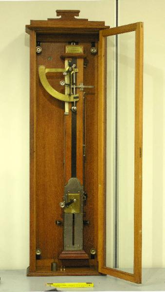 L'apparecchio si compone di un corpo di pompa, ripieno di olio incongelabile, il cui stantuffo è munito di una valvola manovrabile dall'esterno che regola la discesa dello stantuffo stesso, solidale con il carrello al quale è assicurato il capo inferiore del filo in esame. Una scala verticale graduata in millimetri serve per la determinazione dell'elasticità ed in essa le cifre segnano un percorso doppio di quello effettivo, cosicchè si ha direttamente l'allungamento percentuale e non quello riferito ai 50 cm di filo sui quali si opera; la graduazione va da 0 a 400. Il settore metallico a denti applicato alla parte superiore dell'apparecchio serve per la lettura della tenacità in grammi. L'indice indicatore della tenacità è mosso dalla discesa del serrafilo a cui è attaccato l'altro capo del filo; esso scorre per mezzo di un cricchetto doppio sui denti del settore metallico, arrestandosi subito al momento della rottura del filo contemporaneamente alla scala dell'elasticità: in tal modo con un'unica prova è possibile leggere entrambi i risultati. Una leva posta in alto a destra è collegata tramite una molla allo stantuffo e ne comanda la discesa. Lo strumento possiede una doppia graduazione in grammi: da 100 a 300 la prima, e da 0 a 150 la seconda. Lungo il fianco destro del serimetro corre un filo a piombo per la messa in bolla. Lo strumento è corredato da due pesini per il pretensionametno del filo da esaminare. Il serimetro è montato su di una cassetta a facce rettangolari in legno di rovere, e racchiuso in un armadietto a vetri con snodo completo delle antine che permette di operare senza togliere l'apparecchio dalla sua custodia. Piastra metallica in alto "Sistema brevettato"; incisione in basso: "Stagionatura Anonima - Milano - Via Moscova 33 - Serimetro Perfezionato"