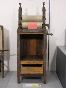 L'apparecchio è formato da un corpo in legno e ferro che porta, nella parte superiore, una coppia di cilindri rotanti in oppsta direzione per l'azionamento di una manovella.