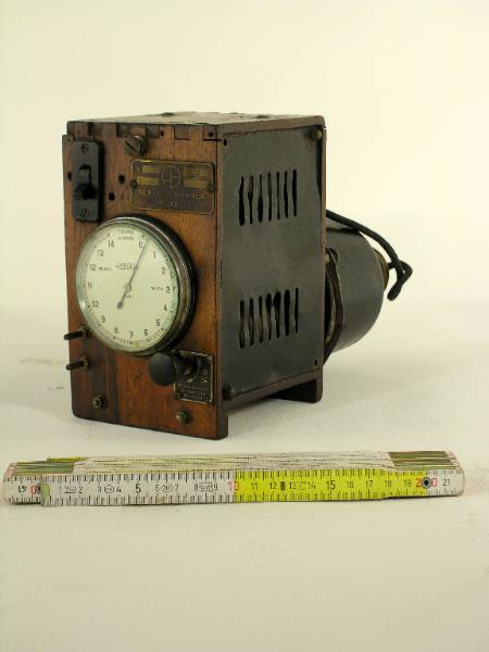 L'apparecchio è costituito da un corpo motore da cui sporge, nella parte posteriore, un cilindro dotato di una finestra. All'interno di questo un secondo cilindro, rotante e dotato di alcune fessure, all'interno del quale trova posto una lampadina: nel momento in cui la fessura del cilindro rotante passa davanti alla finestra è visibile un lampo di luce. Il cilindro rotante è coassiale ad una piccola puleggia scanalata che, tramite una cinghia (mancante) riceve il movimento di una seconda puleggetta posta più in alto e di poco sporgente dal corpo dello strumento. Nella parte anteriore un quadrante indicante i "tours x 1000", graduato da 0 a 14, con il marchio "Jaeger". Poco sotto un reostato e in alto un interruttore acceso/spento. Etichetta metallica "Alberto Branca - Milano - V.115 - P 50"