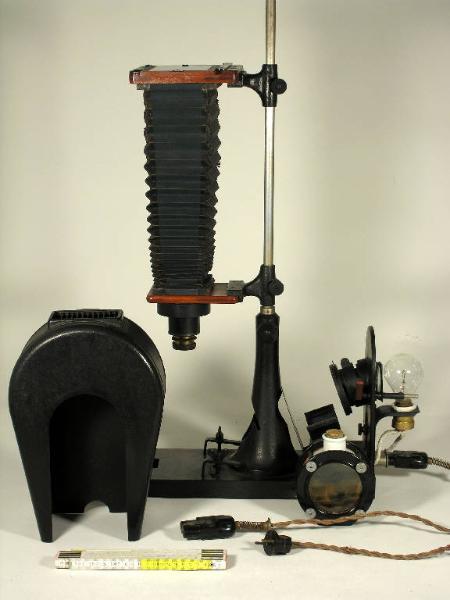 L'oggetto è costituito da un sistema di illuminazione (e dalla relativa protezione in ferro verniciato) e da una struttura regolabile in altezza che porta le lenti e l'oculare. Nella parte alta un cursore graduato e numerato, porta la scritta "Carl Zeiss - Jena". Dall'osservazione di residui verdi presenti attorno al tappo della bottiglietta si può ipotizzare che la soluzione contenuta sia una soluzione di sali di Rame.