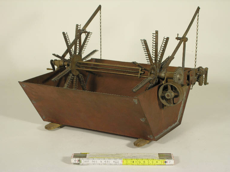 L'apparecchio si compone di una vasca e di un soprastante supporto a raggi con ganci (la "stella"), che mantengono in tensione il tessuto trattandolo con delicatezza: si evitano sia la formazione di pieghe (che causerebbero difetti di tintura) che lo sfregamento del tessuto (che causerebbe danni fisici). Etichetta metallica: "Officine Meccaniche- Fonderie / Cairoli-Fontana-Lanfranconi / Via Pannilani 1 / Como / telegr Excelsior / Pompe, macchine ed apparecchiature per: Tintoria, Apparecchiatura, Tessitura"