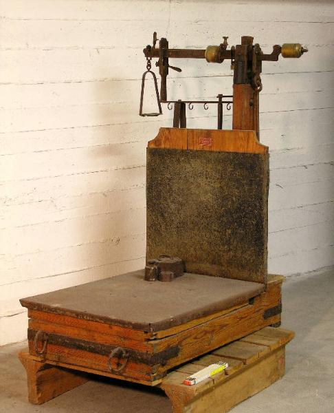 L'oggetto completo è costituito dalla bilancia e da 4 pesi di rapporto: due da 5Kg, uno da 1Kg e uno da 100g. Piattaforma oscillante di pesatura con parete verticale in legno, entrambie foderate di lamiera. Giogo graduato in ferro, con romano e nonio in ottone. Massa regolatrice in ottone regolabile a chiavetta, posta all'estremo del braccio minore; all'estremità del braccio maggiore un cestello per i pesi di rapporto, necessari ad aumentare la portata. Un gancio permette il bloccaggio del piano in posizione di riposo. Etichetta metallica: "Curioni - Como-Camerlata-Cantù"