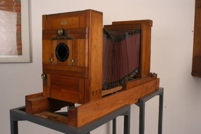 L'oggetto è costituito da un apparecchio fotografico (due strutture in legno, collegate da un mantice in tela) mobile lungo due rotaie. Mancano alcune parti: nella parte anteriore mancano le due guide allungabili ed il supporto porta-disegno; manca l'obiettivo, inserito a vite nel foro filettato anteriore; manca lo "chassis" con il vetro smerigliato che, inserito precedentemente e al posto dello chassis della pellicola, serviva per la messa a fuoco e la messa in misura del disegno a rapporto. Etichetta metallica sul fronte macchina: "Lamperti e Garbagnati - Milano"