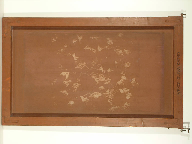 L'oggetto è costituito da una cornice di legno sulla quale è teso e fissato con chiodi il buratto fotoinciso. Due viti metalliche alle estremità di un lato corto servono per fermare il quadro nelle apposite sedi fissate lungo la guida in ferro che corre parallela al tavolo da stampa: la loro funzione è segnare il rapporto del quadro. Su un fianco è dipinto il numero del disegno: "1130"