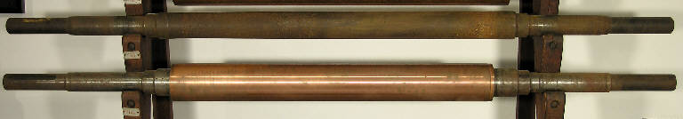 Cilindro in rame pronto per l'incisione, montato su mandrino in acciaio