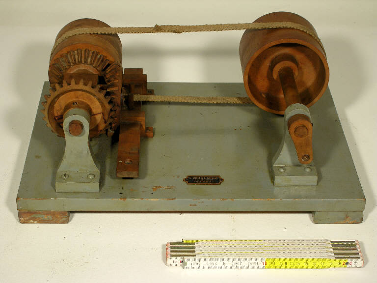 L'oggetto è un modellino didattico in legno verniciato che illustra la trasmissione parallela di un moto continuo, nella stessa direzione ed in direzione opposta rispetto a quello della puleggia motrice. A destra la puleggia piana che tramette il suo movimento tramite una cinghia. A sinistra una successione di tre pulegge: la prima trasmette il movimento nella stessa direzione (il suo asse di rotazione si prolunga in quello del movimento trasmesso), la seconda ruota a folle, la terza trasmette il movimento in direzione opposta. Quest'ultima ruota è solidale ad una coassiale ruota dentata conica, che ingrana in una ad essa perpendicolare, che ingrana a sua volta in una terza, perpendicolare alla precedente, calettata sul medesimo asse del movimento trasmesso: il risultato del loro funzionamento è la trasmissione del moto in direzione opposta rispetto alla rotazione della manovella. Etichetta metallica: "G. Costa e Giraudo - Modellatori - Torino"