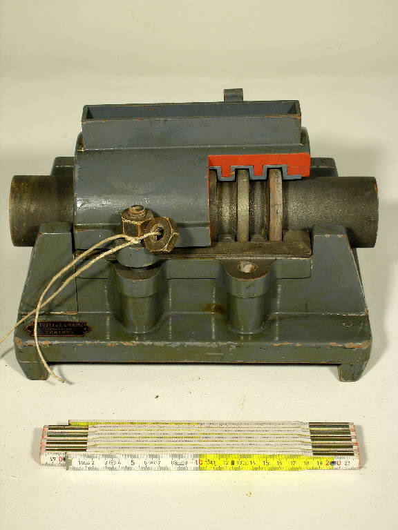 L'oggetto è un modellino didattico in legno verniciato formato da tre parti: una base ed un coperchio con una sedi semicilindriche, in cui alloggia un albero su cui sono calettate tre ruote piane parallele . Etichetta metallica: "G. Costa e Giraudo - Modellatori - Torino"