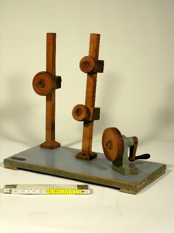 L'oggetto è un modellino didattico in legno verniciato che illustra la trasmissione di un moto continuo con deviazione dello stesso, tramite l'uso di cinghie (mancanti) e pulegge piane con assi formanti un angolo arbitrario con l'asse della puleggia motrice. Etichetta metallica: "G. Costa e Giraudo - Modellatori - Torino"
