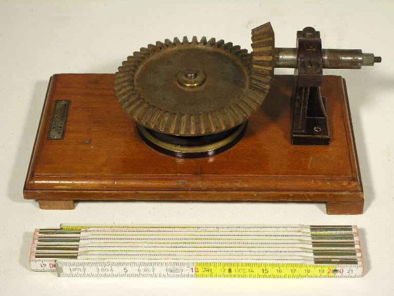 L'oggetto è un modellino didattico in legno verniciato che illustra la trasmissione di un moto continuo con variazione perpendicolare della direzione, tramite una coppia di pulegge dentate coniche. Etichetta metallica: "G. Costa e Giraudo - Modellatori - Torino"